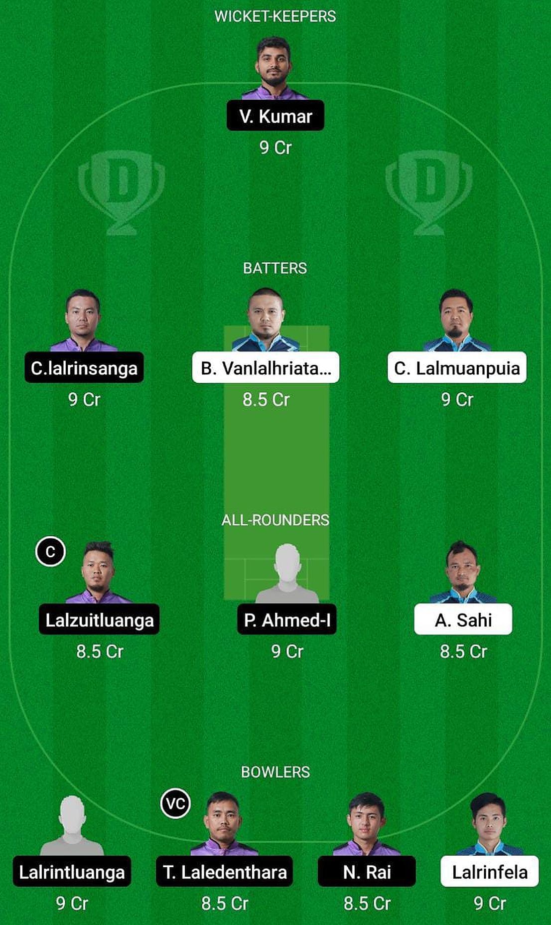 Fantasy Suggestion #1: Vikash Kumar, C Lalrinsanga, Bobby Vanlalhriata Vanchhawng, C Lalmuanpuia, Lalzuitualanga, Parvez Ahmed, Arbin Sahi, Lalrintluanga, TC Laledenthara, Nasib Rai, Lalrinfela