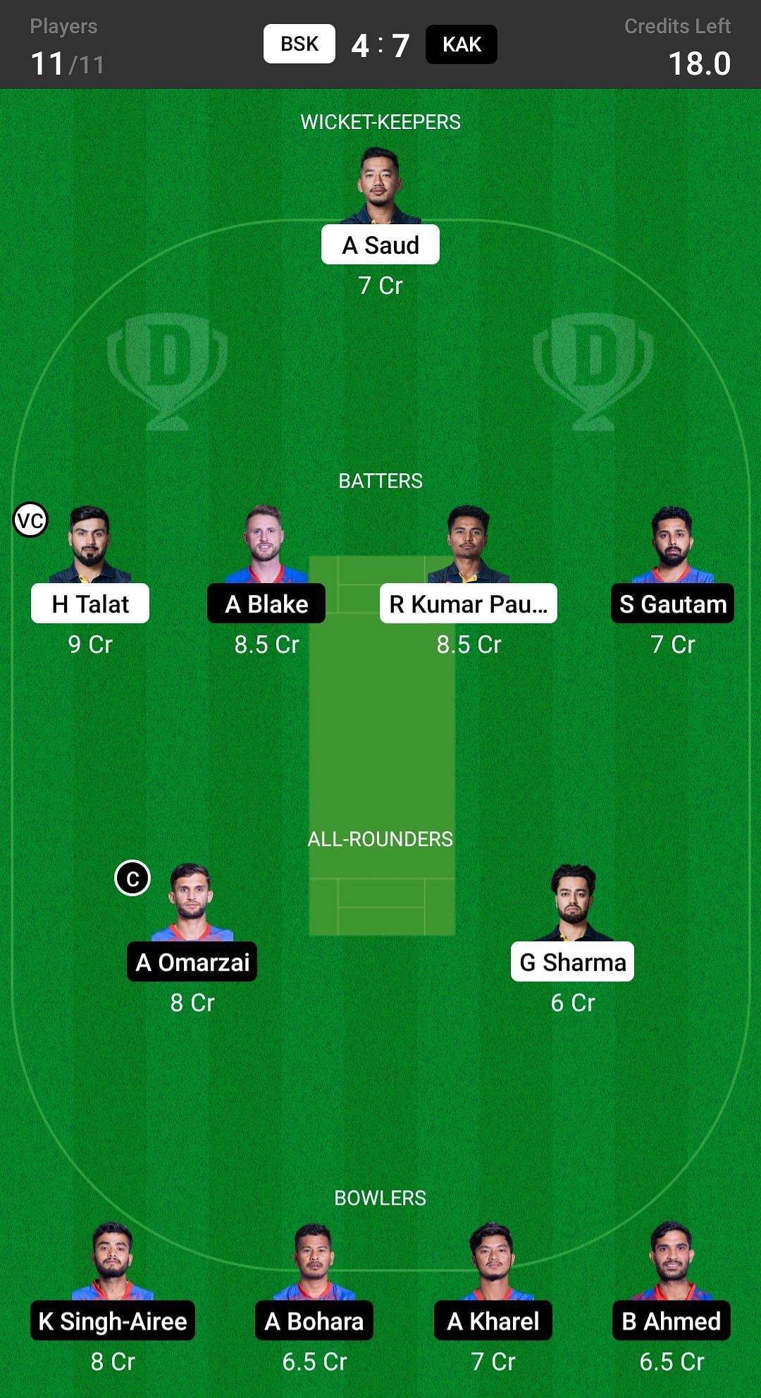 H Talat and A Blake are the two best batsmen picks for the Dream11 team. S Gautam has played exceptionally well in the last match, so he is also a good pick for today's Dream11 team.