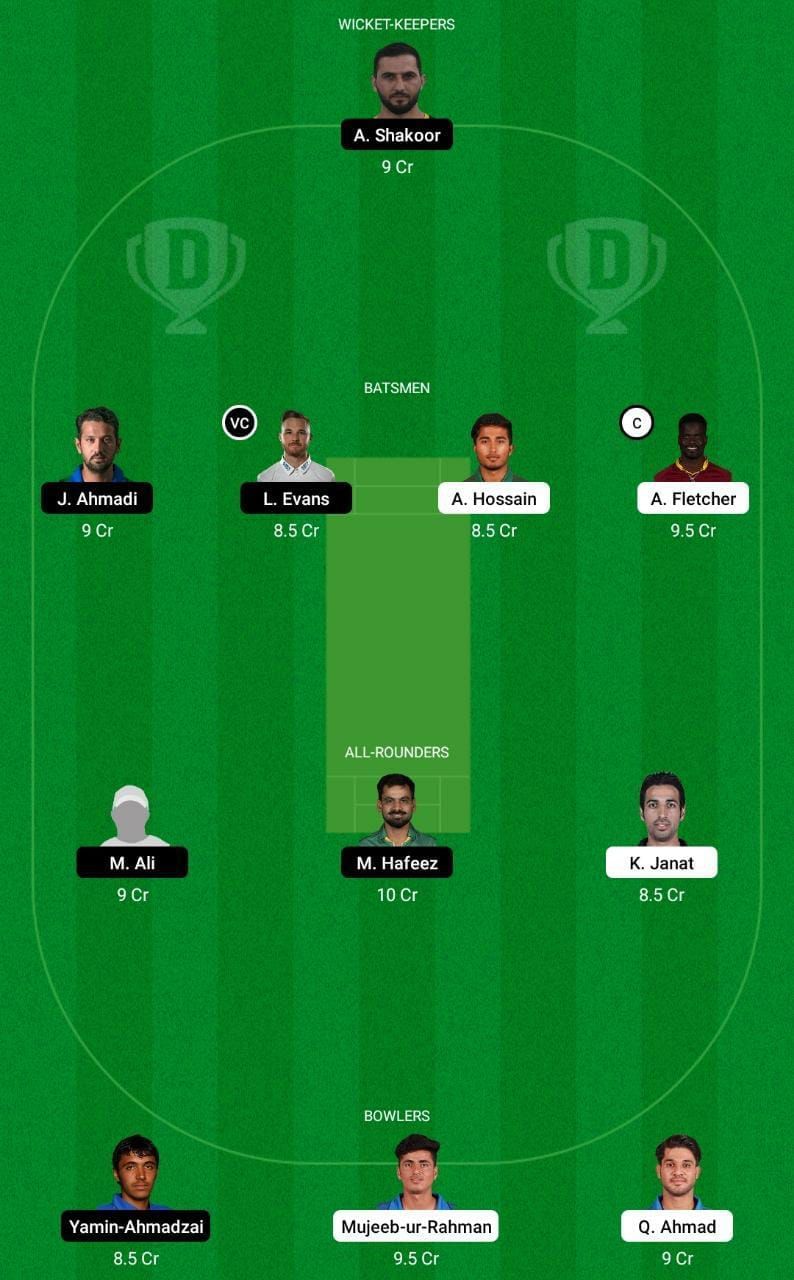 Fantasy Suggestion #1: Abdul Shakoor, Javed Ahmadi, Laurie Evans, Afif Hossain, Andre Fletcher, Muktar Ali, Mohd Hafeez, Karim Janat, Yamin Ahmadzai, Mujeeb ur Rehman and Qais Ahmad