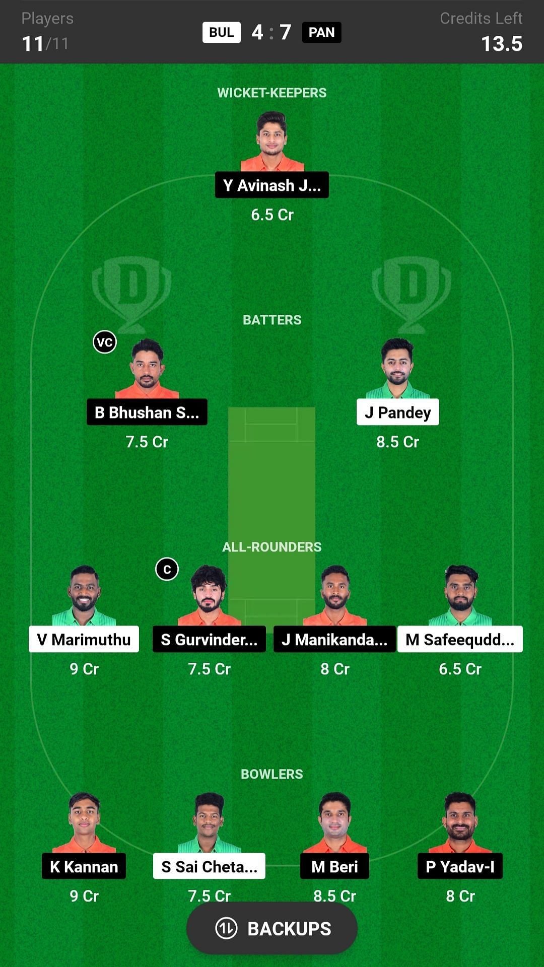 B Bhushan and J Pandey are the two best batsmen picks for the Dream11 team. P Akash played exceptionally well in the last series, so he is also a good pick for today's Dream11 fantasy team.