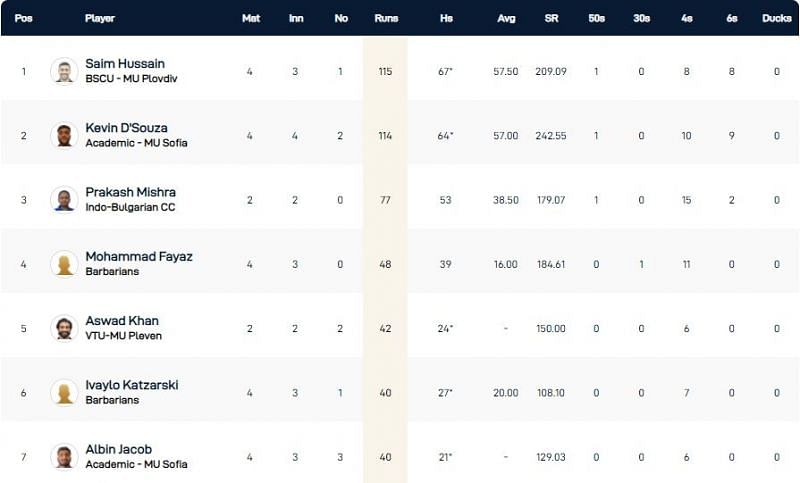 Kevin D'Souza of Academic - MU Sofia is placed second on the run-scoring charts. He has smashed 114 runs to date, with an unbeaten 64 as his best effort. D'Souza has scored his runs at an outstanding strike rate of 242.55, with the help of ten boundaries and nine sixes.