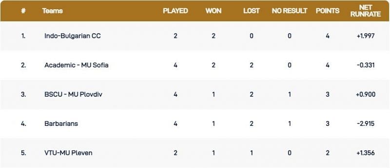 Following are the team standings after the second day of matches in the Bulgaria T10 League 2021: