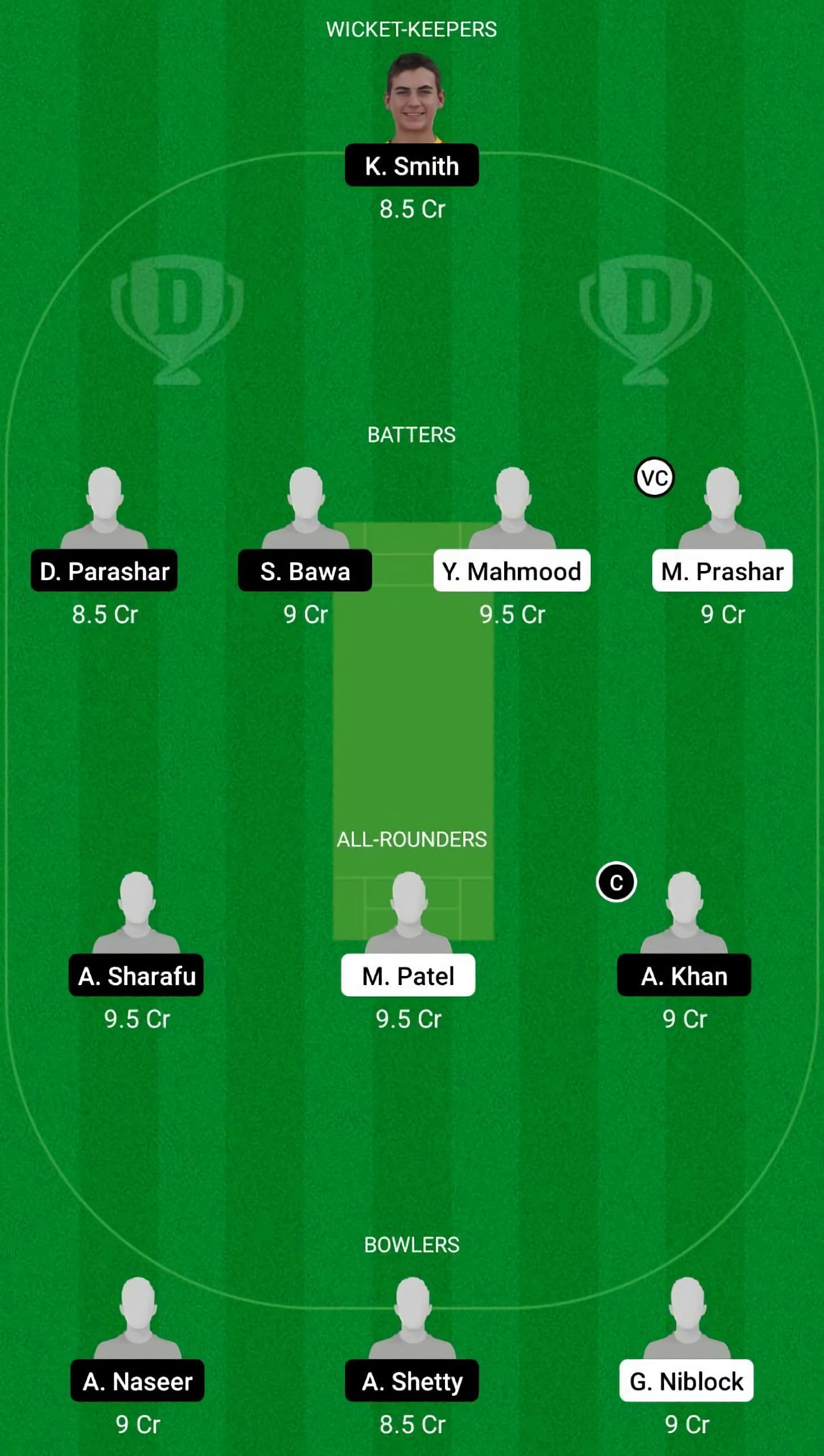 Fantasy Suggestion #2: K. Smith, D. Parashar, M. Prashar, S. Bawa, Y. Mahmood, A. Sharafu, A. Khan, M. Patel, A. Shetty, A. Naseer, G. Niblock