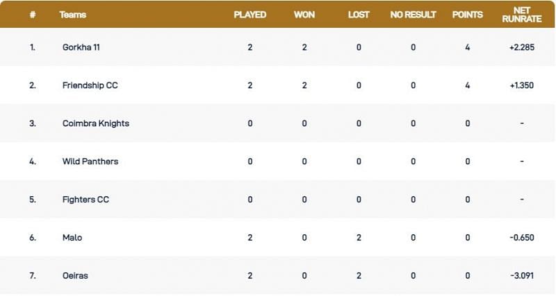 Gorkha 11 and Friendship CC occupy the top two spots in the Cartaxo T10 League 2021 points table. Both sides registered a couple of wins on Monday and have four points to their credit.