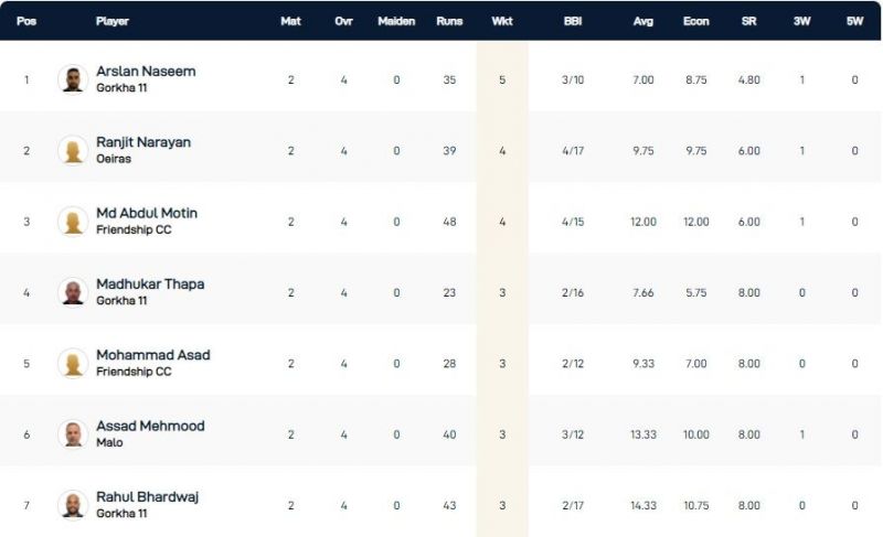 Arslan Naseem of Gorkha 11, with five scalps to his credit, emerged as the highest wicket-taker on Day 1 of the Cartaxo T10 League 2021. He has a spell of 3/10 as his best performance and has an acceptable economy of 8.75.