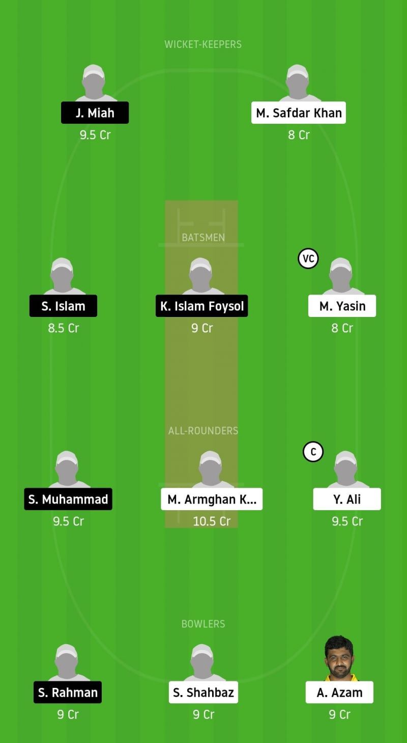 Fantasy Suggestion #1: Jubed Miah, Muhammad Safdar, Sofiqul Islam, Kamrul Islam Foysol, Mohammad Yasin, Saqib Muhammad, Muhammad Armghan Khan, Yasir Ali, Shahedur Rahman, Shahbaz Shaukat, Ali Azam