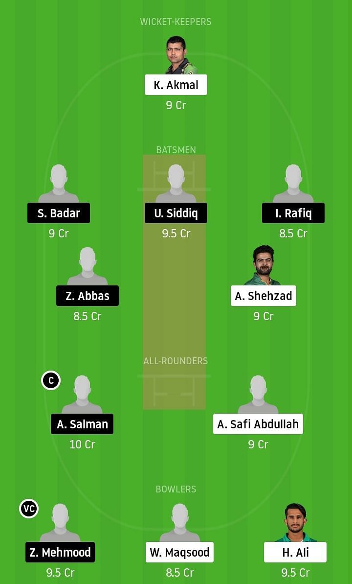 Fantasy Suggestion #1: Kamran Akmal, Ahmed Shehzad, Umar Siddiq, Imran Rafiq, Agha Salman, Saif Badar, Zain Abbas, Hasan Ali, Waqas Maqsood, Zahid Mehmood, Ahmed Safi Abdullah
