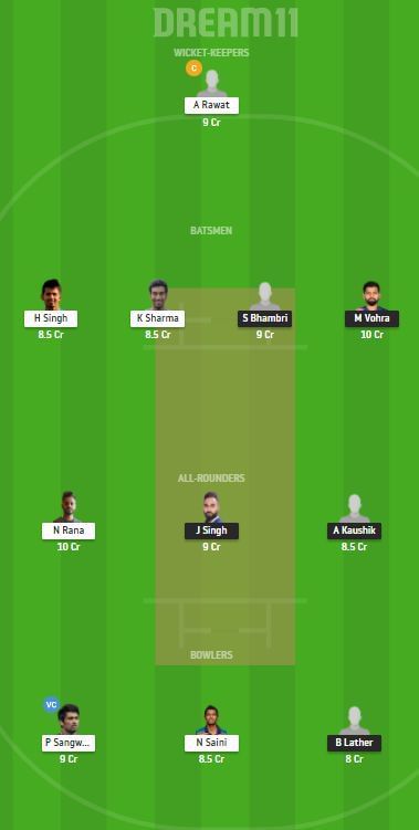 Fantasy Suggestion #2: Anuj Rawat (C), Himmat Singh, Ankit Kaushik, Nitish Rana, Kshitiz Sharma, Pradeep Sangwan (VC), Navdeep Saini, Manan Vohra, Shivam Bhambri, Jaskaran Singh, Bhagmender Lather.