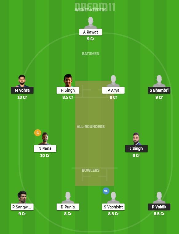 Fantasy Suggestion #1: Nitish Rana, Manan Vohra, Shivam Bhambri, Himmat Singh, Jaskaran Singh, Priyansh Arya, Anuj Rawat, Parmesh Vaidik, Shivank Vashisht, Pradeep Sangwan, Deepak Punia.