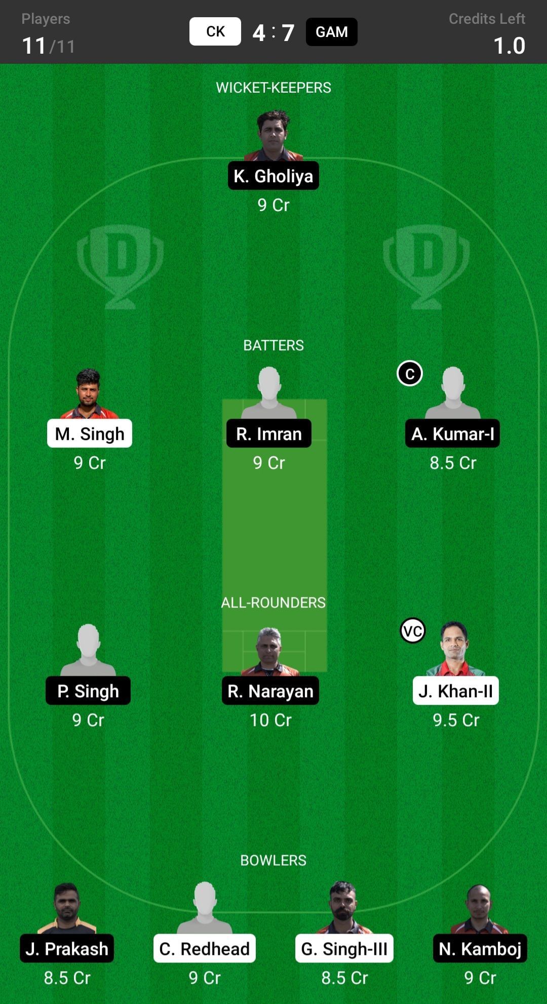 P Singh and R Narayan are the best Dream11 all-rounder picks for this game. They bat in the top order and also complete their quota of overs. J Khan-II is another good pick.