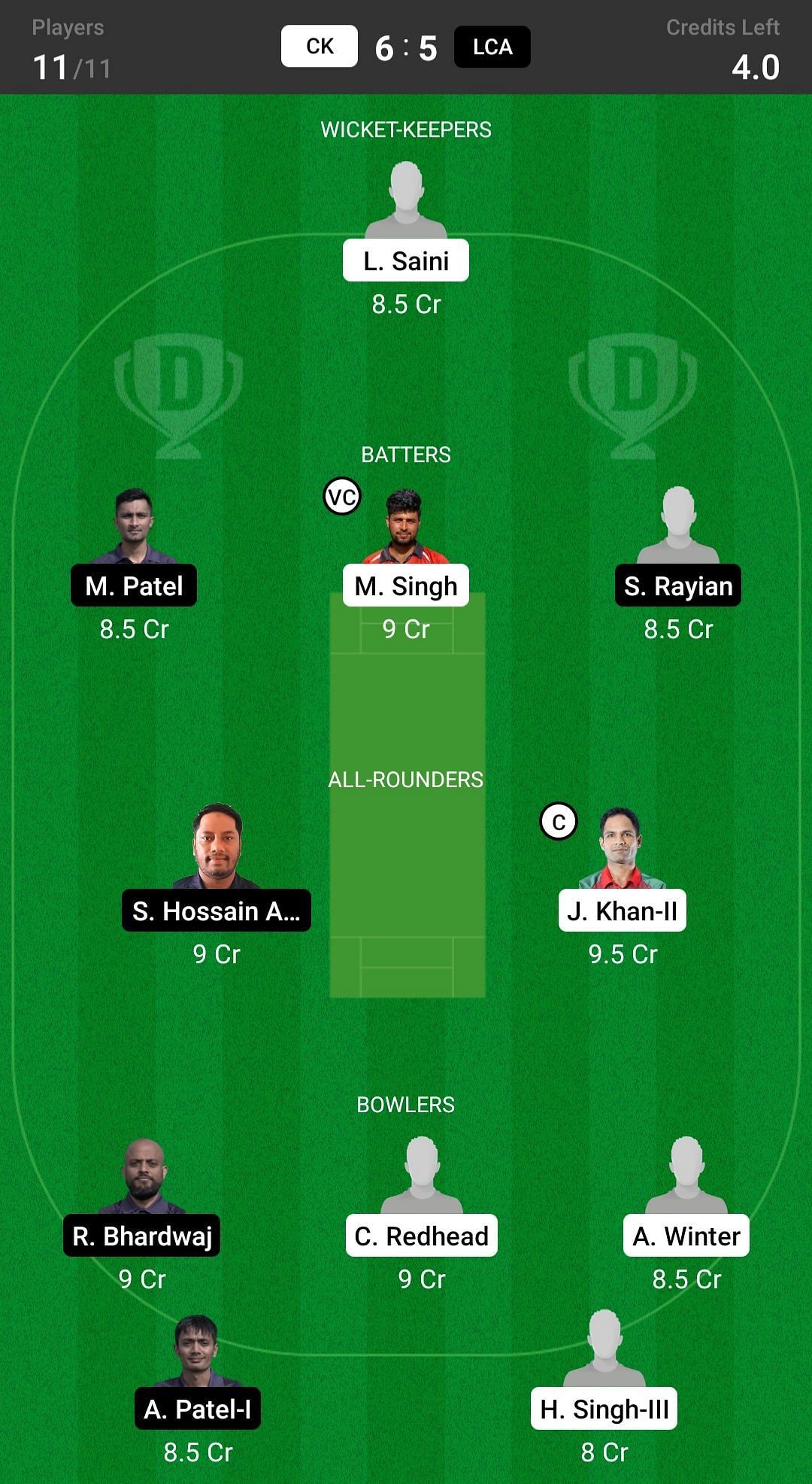 Fantasy suggestion #1: L Saini, M Singh, M Patel, S Rayian, S Hossain, J Khan-II, C Redhead, R Bhardwaj, A Patel, A Winter, H Singh-III