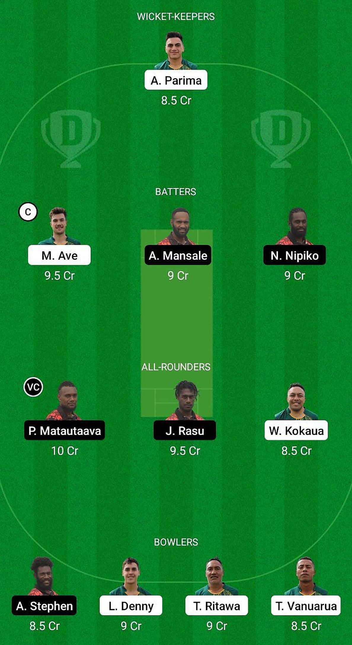 Ma'ara Ave (c), Davis Teinaki, Aue Parima (wk), Thomas Parima, Cory Dickson, Liam Denny, Benjamin Vakatini, William Kokaua, Gabe Raymond, Tomakanute Ritawa, Tomasi Vanuarua