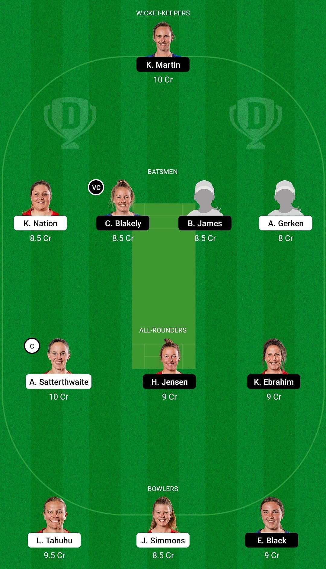 Suzie Bates (C), Kate Ebrahim, Caitlin Blakely, Polly Inglis, Hayley Jensen, Katey Martin (WK), Bella James, Eden Carson, Emma Black, Sophie Oldershaw, Molly Loe.
