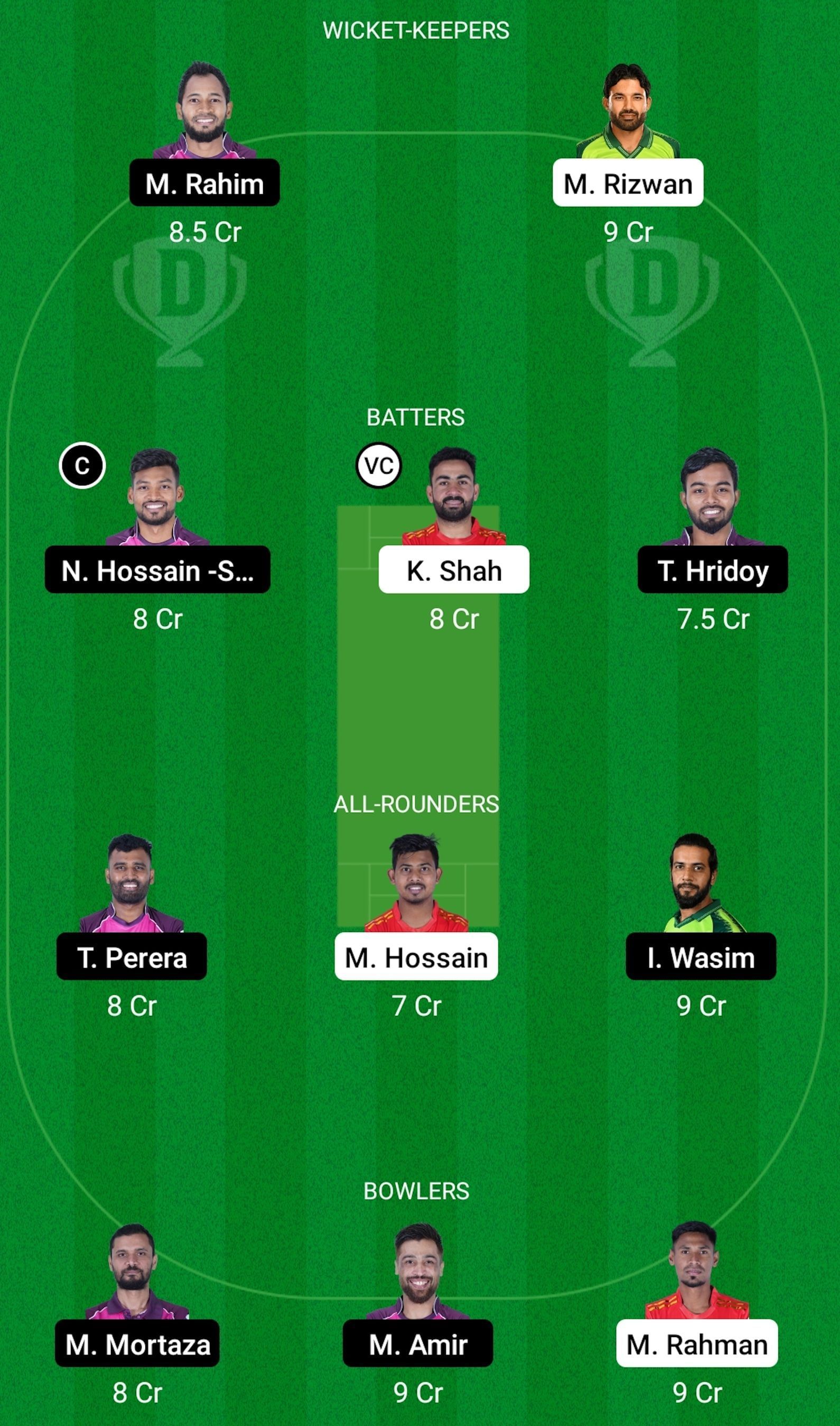 Mohammad Haris, Najmul Hossain Shanto, Tawhid Hridoy, Musfiqur Rahim, Imad Wasim, Thisara Perera, Akbar Ali, Mohammad Amir, Mashrafe Mortaza, Rubel Hossain, and Nazmul Islam.