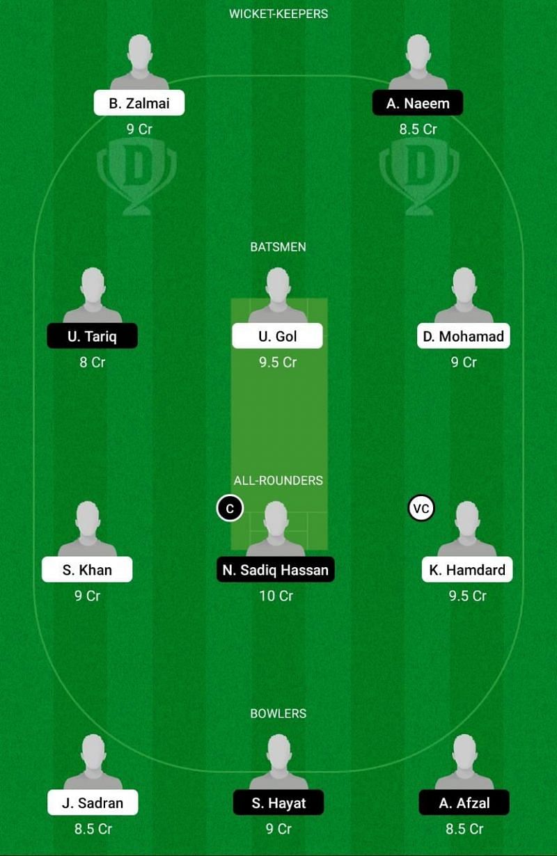 Fantasy Suggestion #1: Amir Naeem, Bilal Zalmai, Umair Tariq, Dost Mohamad, Usman Gol, Naveed Hassan, Khan Agha Hamdard, Shadnan Khan, Adal Afzal, Jaweed Sadran, Sikander Hayat