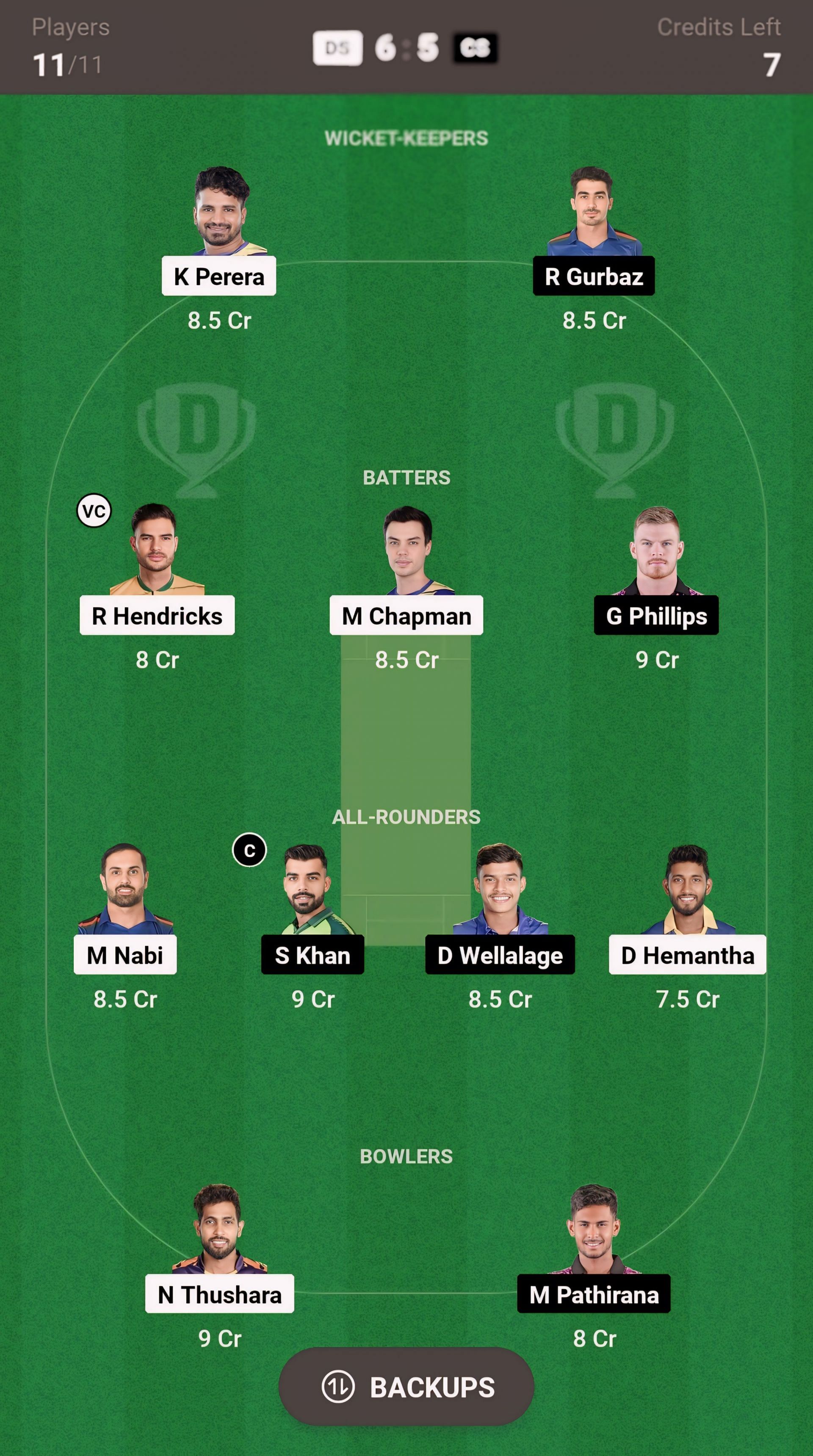 Kusal Perera (wk), Nuwanidu Fernando, Mark Chapman, Chamindu Wickramasinghe, Mohammad Nabi (c), Mustafizur Rahman, Lahiru Udara, Dushan Hemantha, Dilshan Madushanka, Nuwan Pradeep, Reeza Hendricks