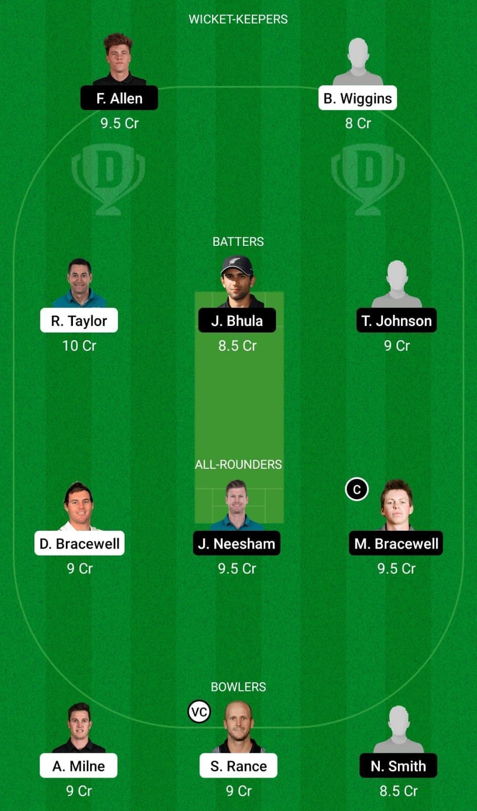 Fantasy Suggestion #2: Fin Allen, Bayley Wiggins, Troy Johnson, Doug Bracewell, Michael Bracewell, Nathan Smith, Seth Rance, Ross Taylor, Jakob Bhula, James Neesham, Adam Milne