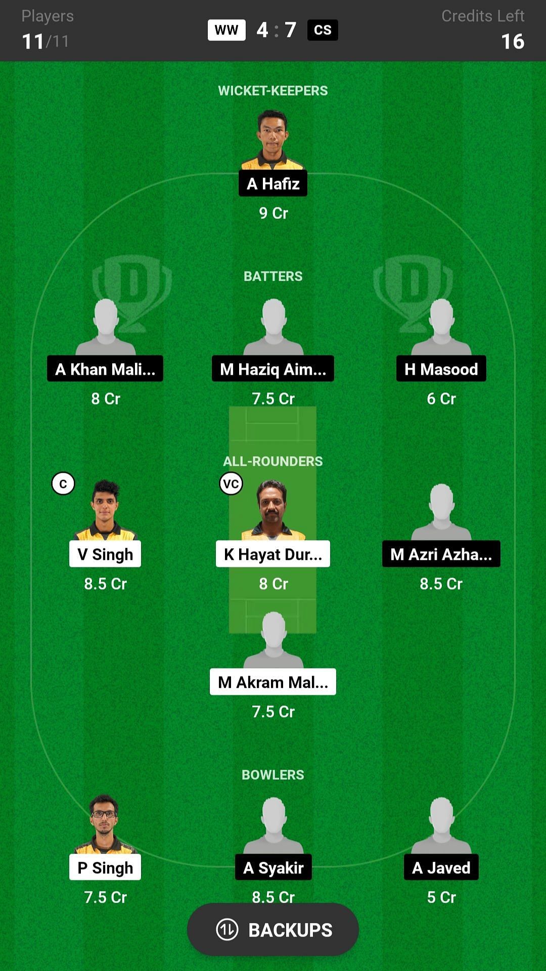 All-rounders: V Singh, M Akram, M Azri, K Hayat, N Ahmed, M Aiman, A Malik