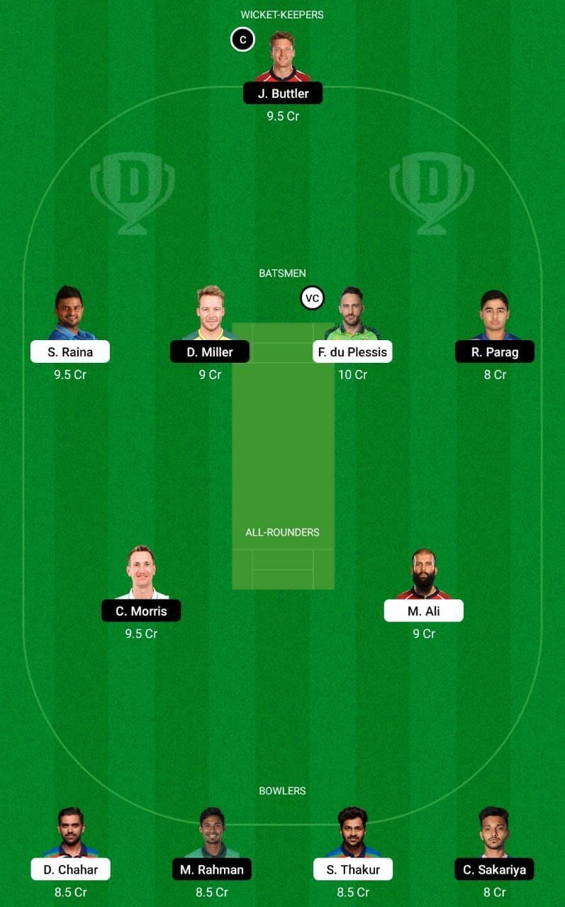 Fantasy Suggestion #1: Jos Buttler, Suresh Raina, David Miller, Riyan Parag, Faf du Plessis, Chris Morris, Moeen Ali, Deepak Chahar, Mustafizur Rahman, Shardul Thakur and Chetan Sakariya
