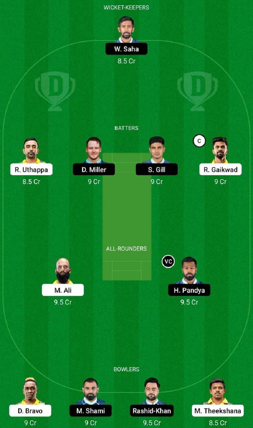 Fantasy Suggestion #2: Wriddhiman Saha, David Miller, Robin Uthappa, Shubman Gill, Ruturaj Gaikwad, Moeen Ali, Hardik Pandya, Mohammed Shami, Rashid Khan, Dwayne Bravo, Maheesh Theekshana.