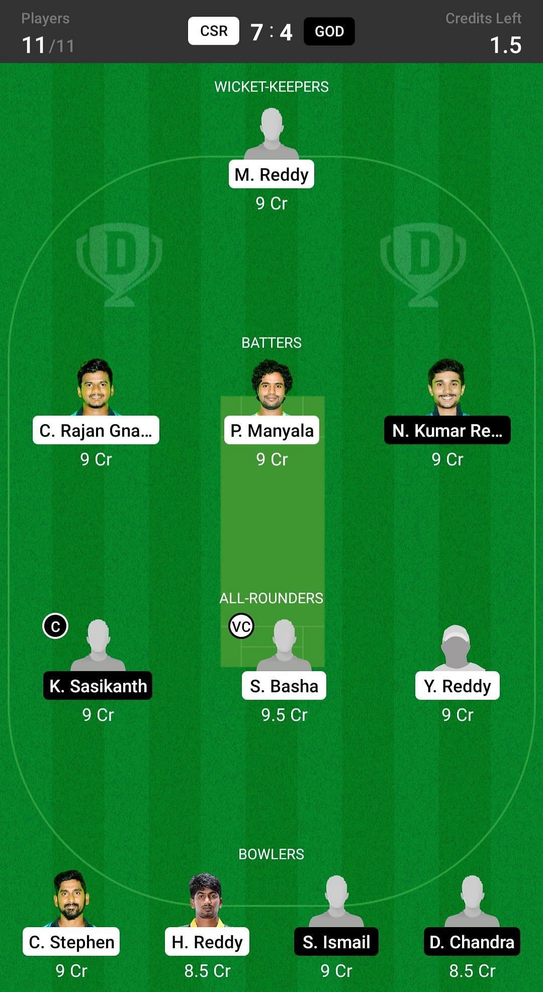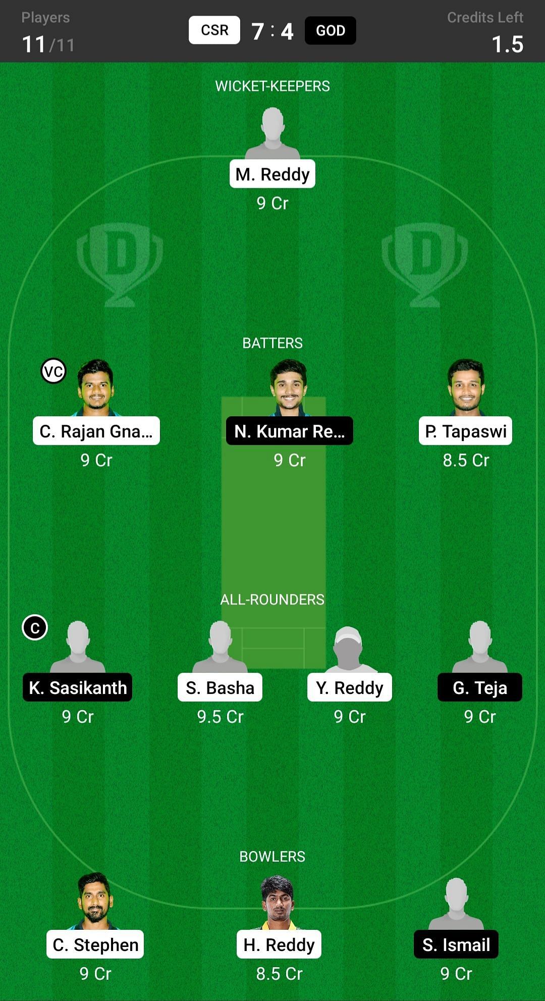 Fantasy suggestion #1: M Reddy, C Rajan, N Kumar, P Tapaswi, K Sasikanth, Y Reddy, G Teja, S Basha, H Reddy, S Ismail, C Stephen