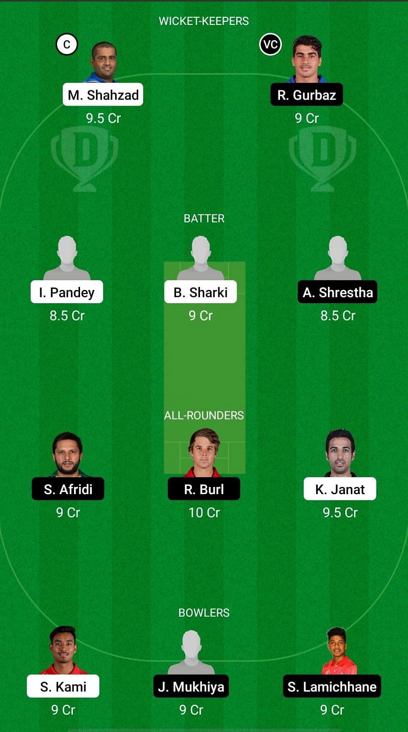 Fantasy Suggestion #1: Mohammad Shahzad, Rahmanullah Gurbaz, Ishan Pandey, Bhim Sharki, Amit Shrestha, Shahid Afridi, Ryan Burl, Karim Janat, Sompal Kami, Jitendra Mukhiya, Sandeep Lamichhane.
