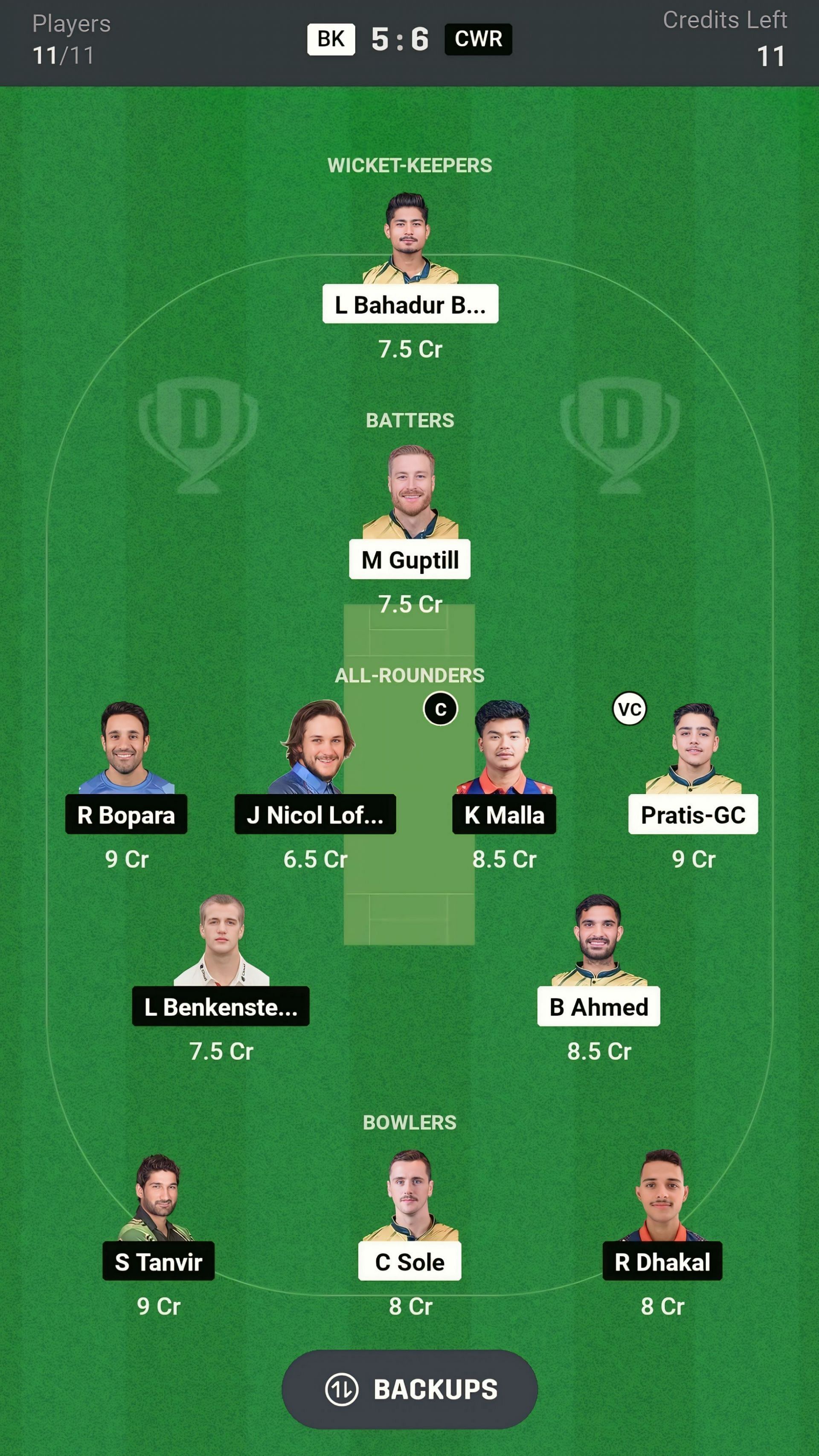 Pratis GC and Kushal Malla are the best all-rounder picks for the Dream11 team. Both players are crucial for today's match. Pratis GC will bat in the top order and complete his quota of overs in today's match. He has smashed 20 runs and taken nine wickets in the last five matches. Luc Benkenstein is another good all-rounder for today's match.