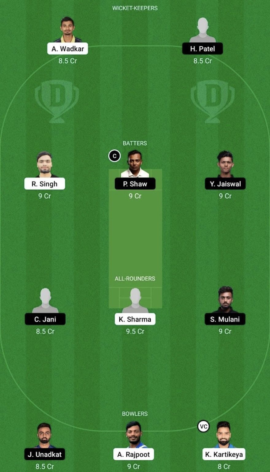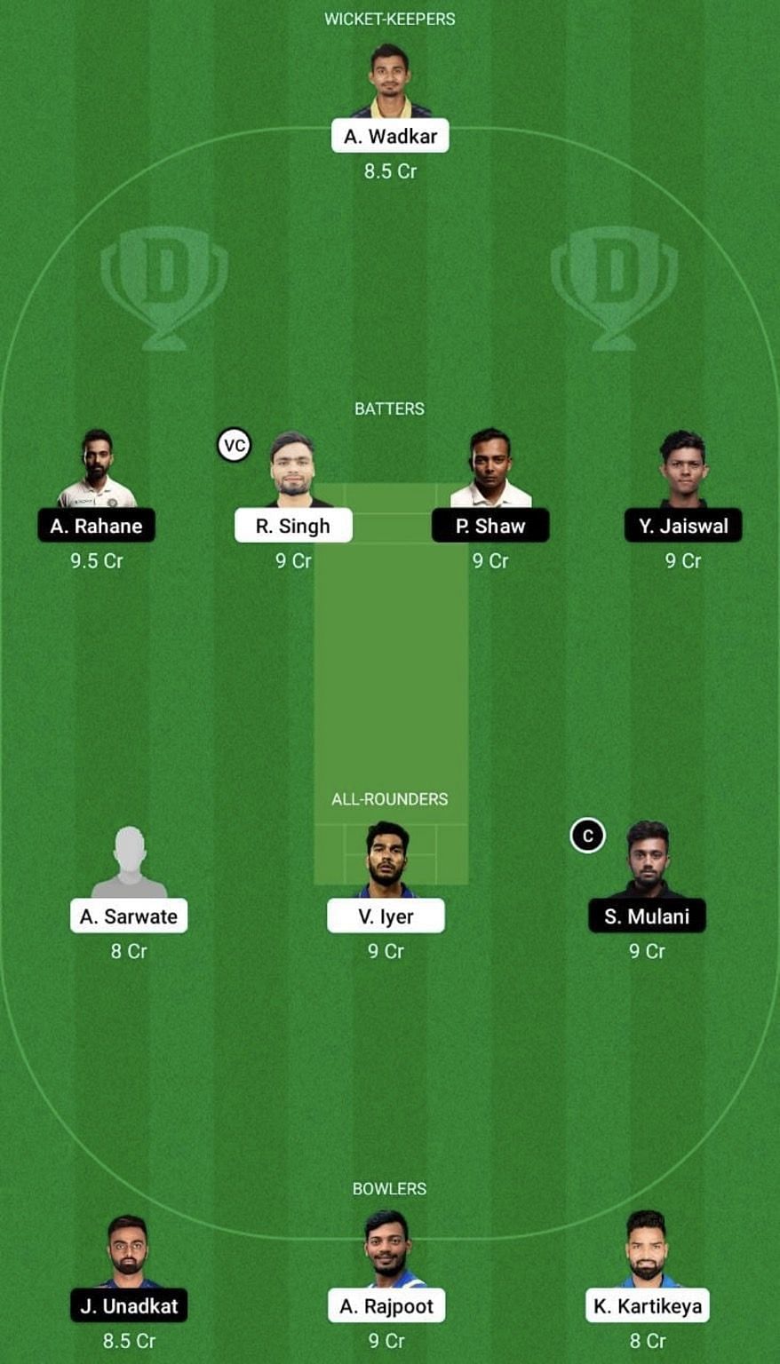 Kumar Kartikeya is a trump card in the Central Zone side given the variety he adds. He was a star performer in the Ranji Trophy, picking up 32 wickets. With the pitch also likely to favor the spinners, Kartikeya could be a viable option as captain or vice-captain.
