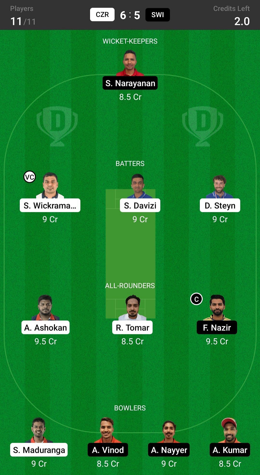 Fantasy suggestion #1: S Narayanan, S Davizi, S Wickramasekara, D Steyn, A Ashokan, F Nazir, R Tomar, A Nayyer, A Kumar, S Maduranga, A Vinod