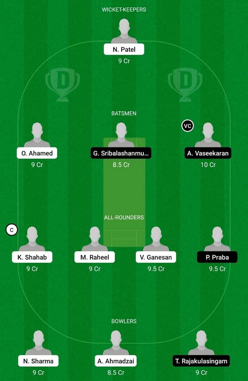 Fantasy Suggestion #1: Nilay Patel, Aritharan Vaseekaran, Oascoroni Ahamed, Gobinath Sribalashanmugan, Kashif Shahab, Muhammad Raheel, Pakeetharan Praba, Venkat Ganesan, Abdul majeed Ahmadzai, Thinesh Rajakulasingam, Neeraj Sharma