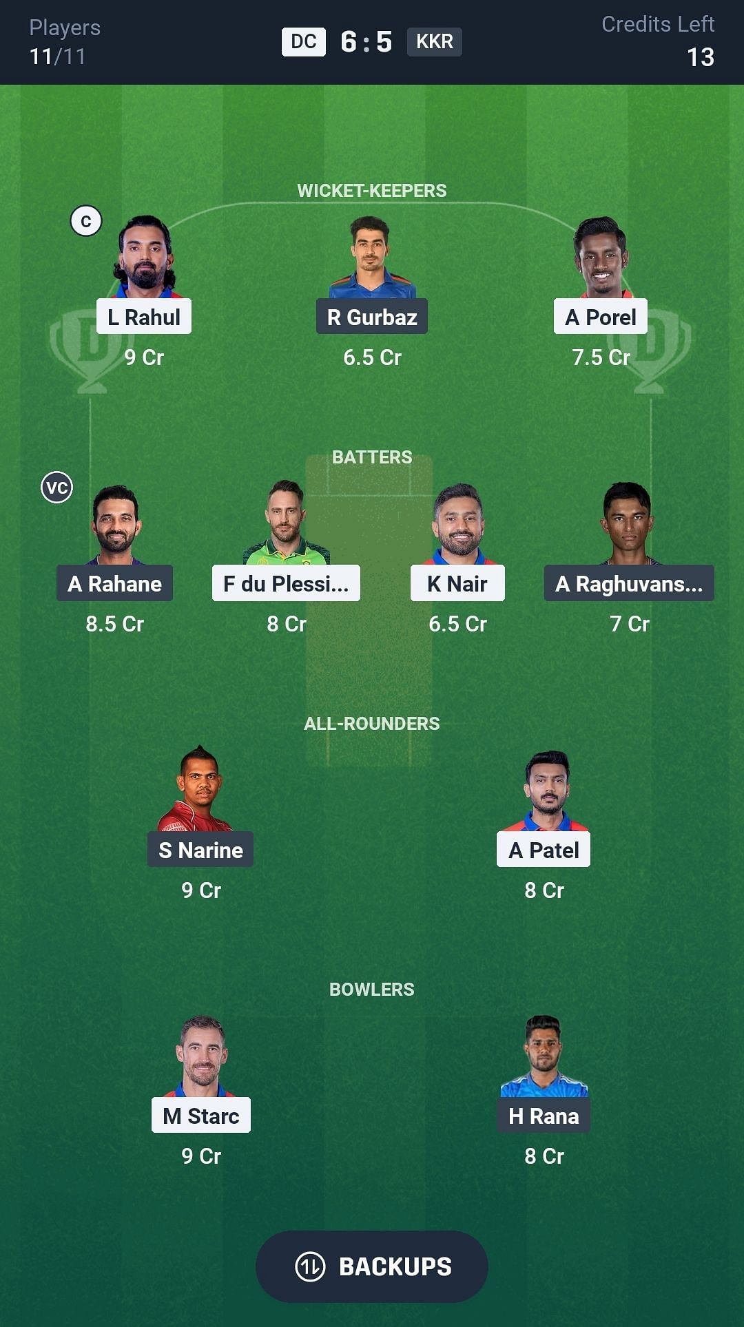 Karun Nair, Abishek Porel, KL Rahul (wk), Axar Patel (c), Tristan Stubbs, Vipraj Nigam, Mitchell Starc, Kuldeep Yadav, Dushmantha Chameera, Mukesh Kumar, Faf du Plessis, Ashutosh Sharma (impact)