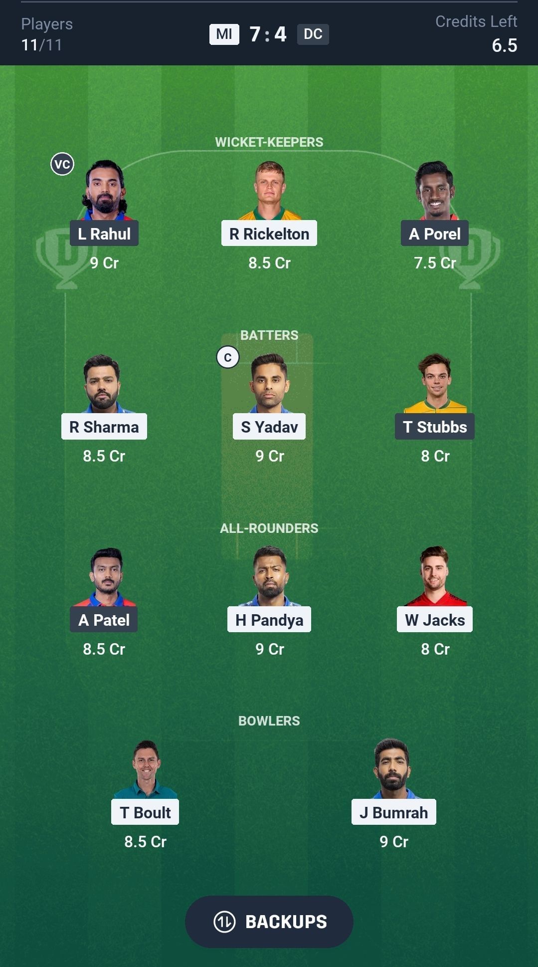 Ryan Rickelton (wk), Will Jacks, Suryakumar Yadav, Tilak Varma, Hardik Pandya (c), Naman Dhir, Mitchell Santner, Deepak Chahar, Trent Boult, Jasprit Bumrah, Vignesh Puthur, Rohit Sharma (impact)