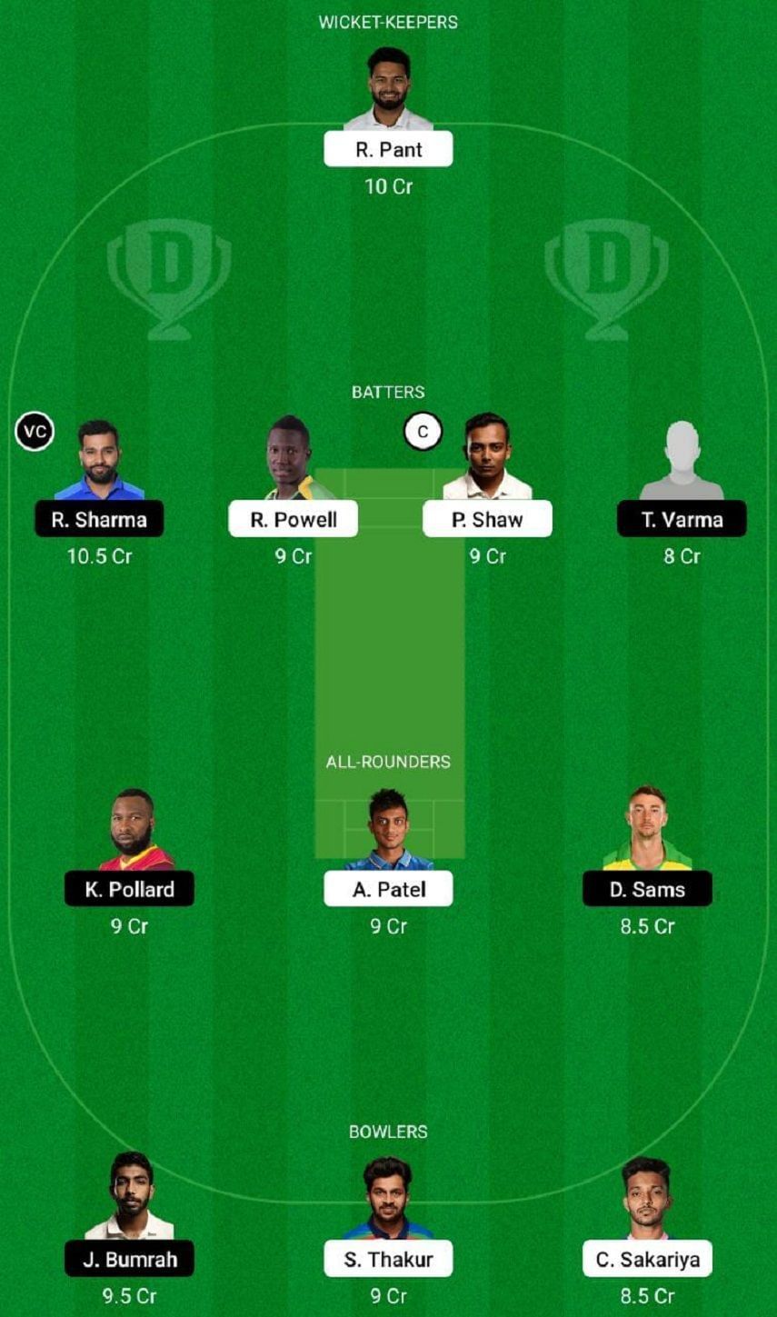 Fantasy Suggestion #2: Rishabh Pant, Rovman Powell, Tilak Varma, Rohit Sharma, Prithvi Shaw, Kieron Pollard, Axar Patel, Jasprit Bumrah, Daniel Sams, Chetan Sakariya and Shardul Thakur.