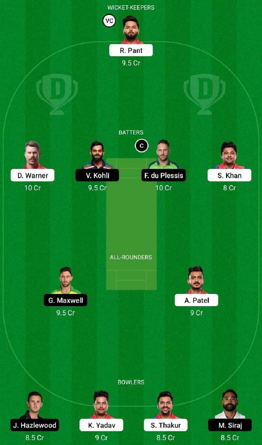 Fantasy Suggestion #1: Rishabh Pant, David Warner, Virat Kohli, Faf du Plessis, Sarfaraz Khan, Glenn Maxwell, Axar Patel, Josh Hazlewood, Kuldeep Yadav, Shardul Thakur and Mohammed Siraj.