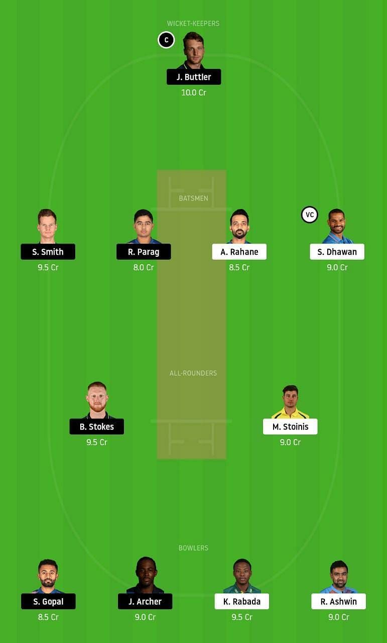 Fantasy Suggestion #1: Jos Buttler, Steve Smith, Riyan Parag, Ajinkya Rahane, Shikhar Dhawan, Marcus Stoinis, Ben Stokes, Jofra Archer, Kagiso Rabada, Ravi Ashwin and Shreyas Gopal