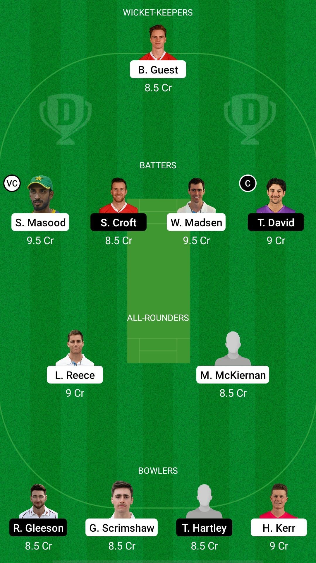 Fantasy Suggestion #2: Brooke Guest, Shan Masood, Steven Croft, Wayne Madsen, Tim David, Luis Reece, Matt McKiernan, Richard Gleeson, George Scrimshaw, Tom Hartley, Hayden Kerr.