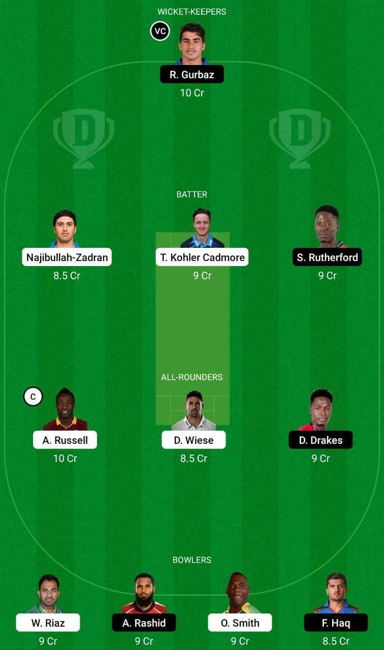 Fantasy Suggestion #2: Rahmanullah Gurbaz, Najibullah Zadran, Tom Kohler-Cadmore, Sherfane Rutherford, Andre Russell, David Wiese, Dominic Drakes, Odean Smith, Fazal Haq, Wahab Riaz and Adil Rashid