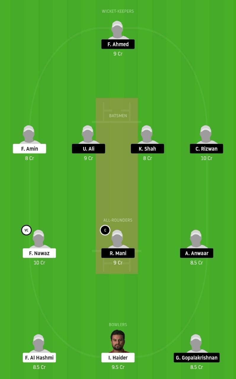Fantasy Suggestion #1: F Ahmed, U Ali, F Amin, K Shah, C Rizwan, R Mani, F Nawaz, A Anwaar, G Gopalakrishnan, I Haider and F Al Hashmi