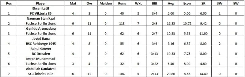 Nauman Stanikzai of Fuchse Berlin Lions, who has dismissed seven opposition batsmen, occupies second spot on the wicket-taking charts. He has a best effort of 2/9 and has conceded an average of 10.72 runs per over.