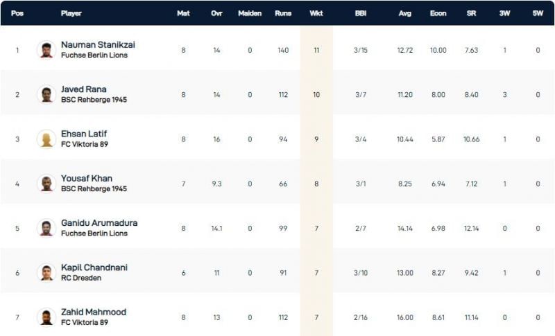 Javed Rana of BSC Rehberge 1945, with 10 scalps to his name, occupies second spot on the wicket-taking charts. He has a best effort of 3/7 and has an acceptable economy of 8.00.