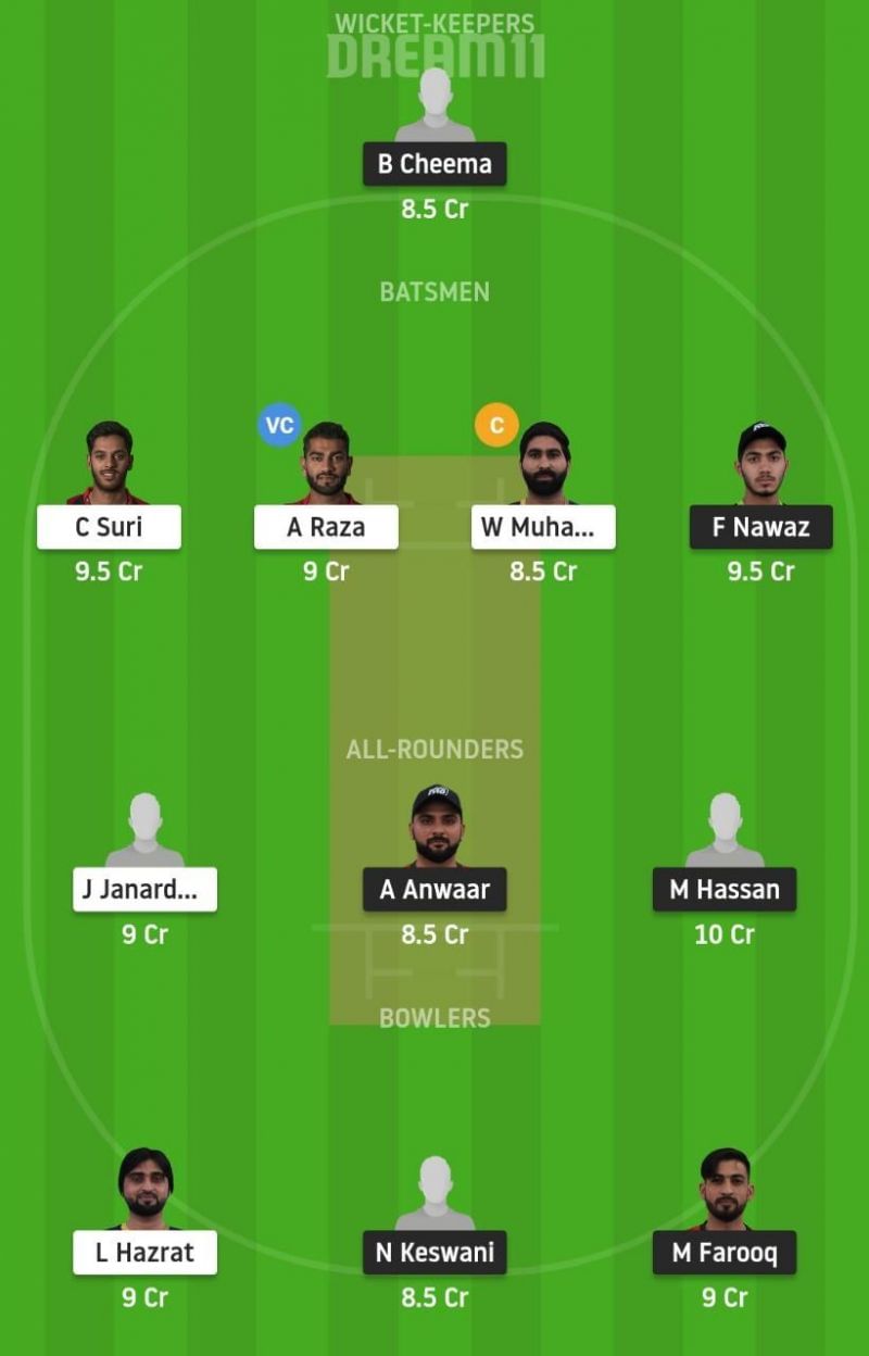 Fantasy Suggestion #1: Bilal Cheema, Chirag Suri, Waseem Muhammad, Ahmed Raza, Fahad Nawaz, Muhammad Hassan, Jiju Janardhanan, Ali Anwaar, Nilansh Keswani, Laqman Hazrat, Muhammad Farooq