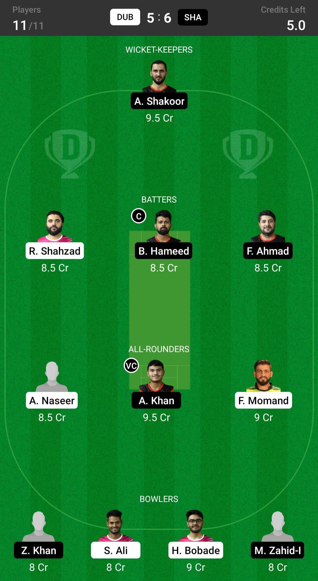 Fantasy suggestion #1: A Shakoor, R Shahzad, B Hameed, F Ahmad, A Khan, A Naseer, F Momand, Z Khan, M Zahid, S Satish, H Bobade