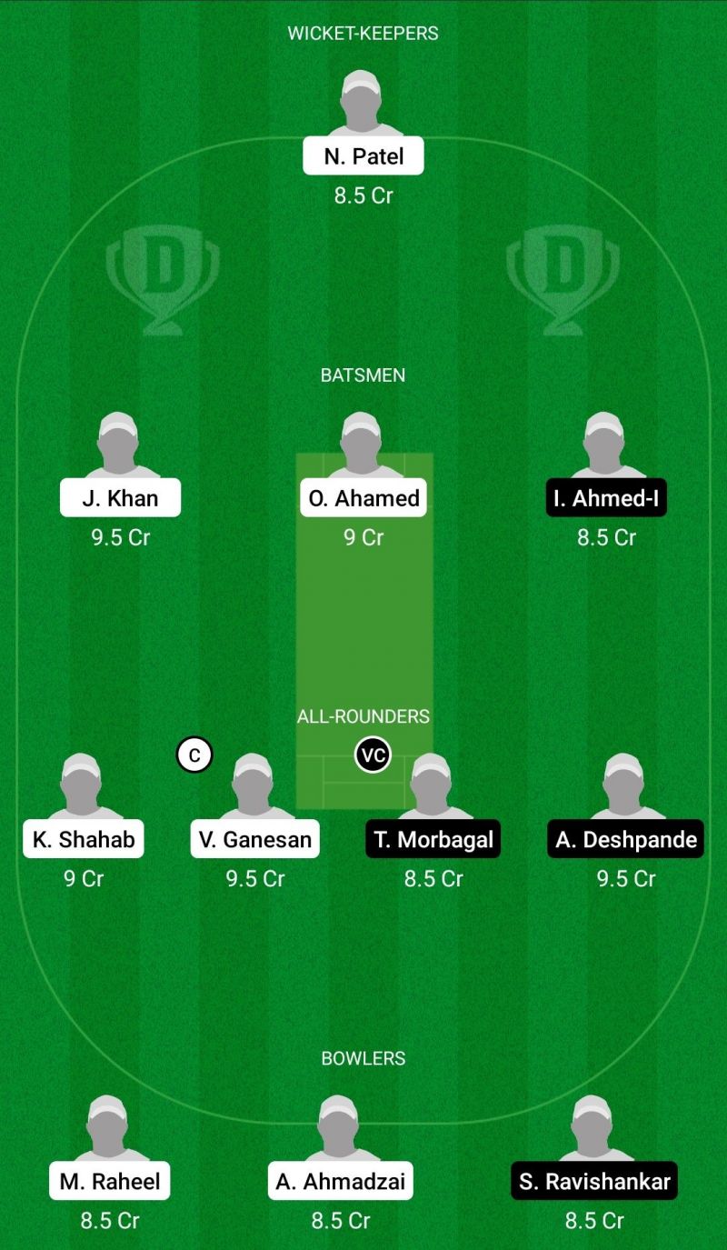 Fantasy Suggestion #1: Nilay Patel, Jamshed Khan, Oascoroni Ahamed, Irfan Ahmed, Kashif Shahab, Venkat Ganesan, Tejas Morbagal, Ameya Deshpande, Muhammad Raheel, Abdulmajeed Ahmadzai, Sandheep Ravishankar