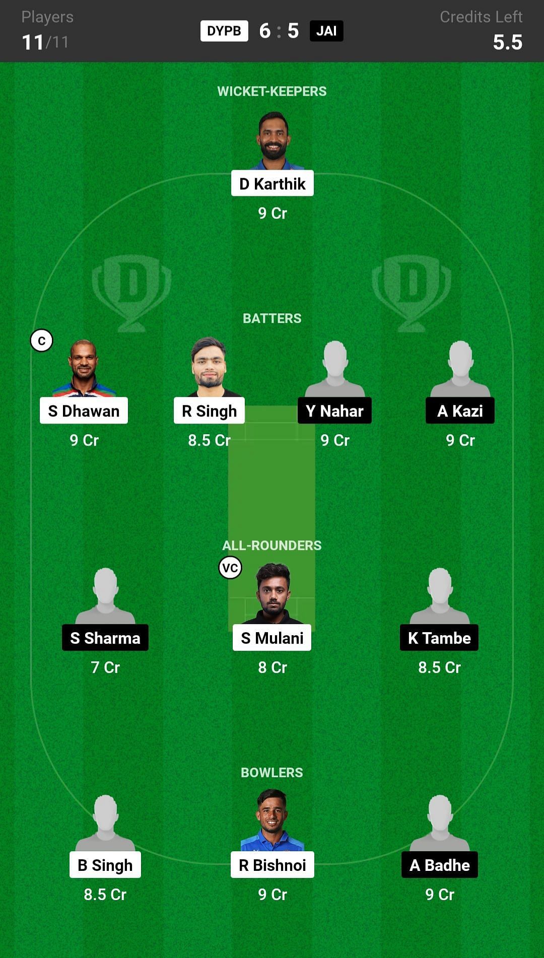 D Karthik (wk), H Tamore, S Dhawan, R Singh, Y Dhull, S Khan, S Mulani, A Yadav, R Bishnoi, B Singh, V Sinha