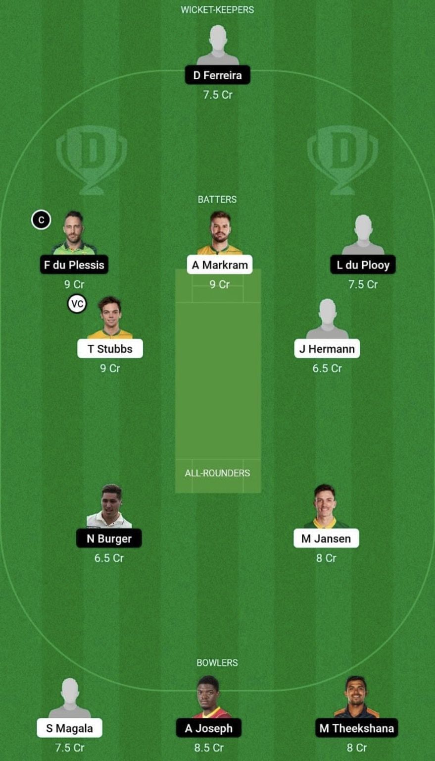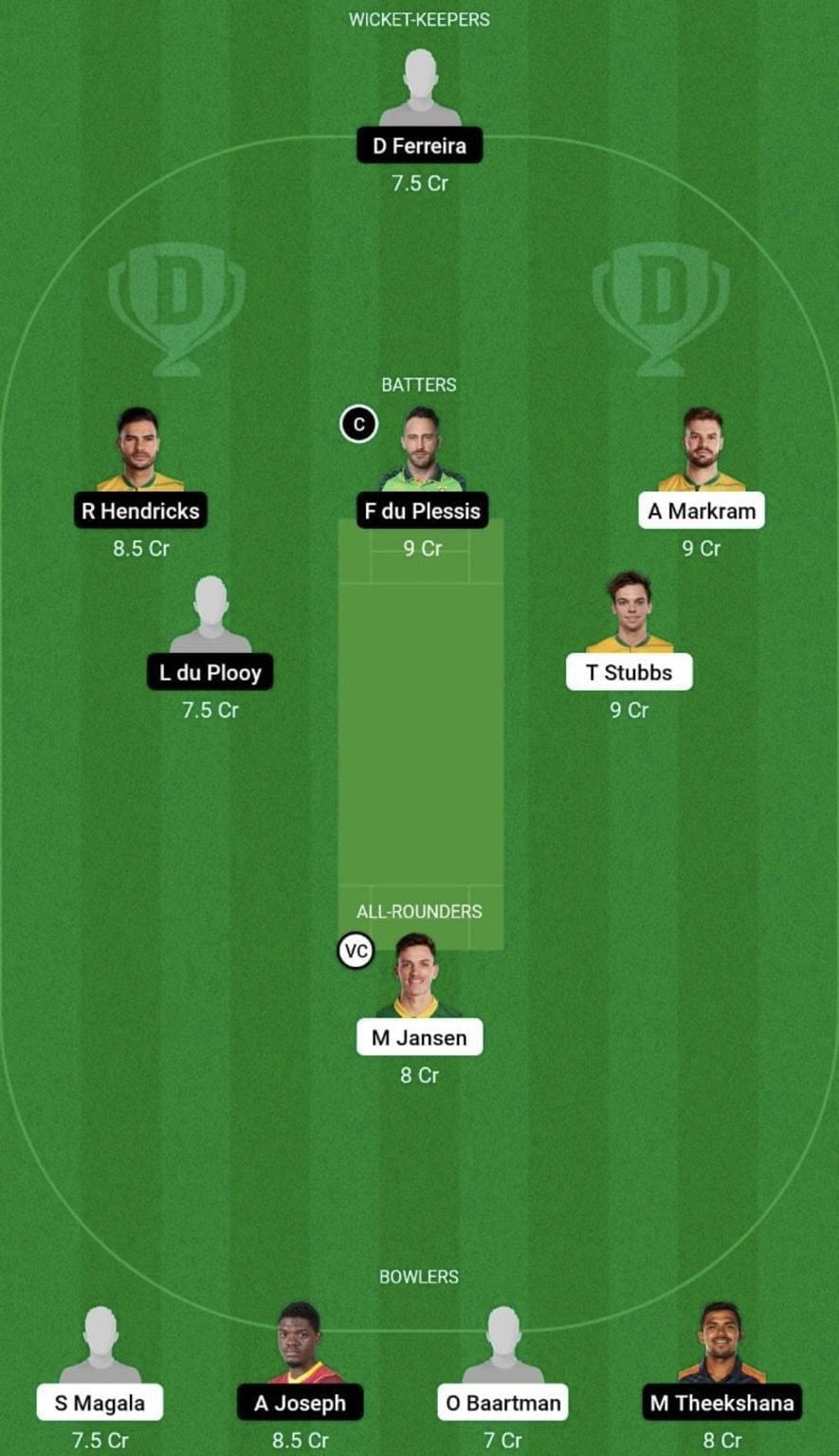 Faf du Plessis (c), Reeza Hendricks, Leus du Plooy, Kyle Verreynne (wk), Janneman Malan/Sibonelo Makhanya, Donavon Ferreira, Romario Shepherd, Gerald Coetzee, Alzarri Joseph, Maheesh Theekshana and Nandre Burger.