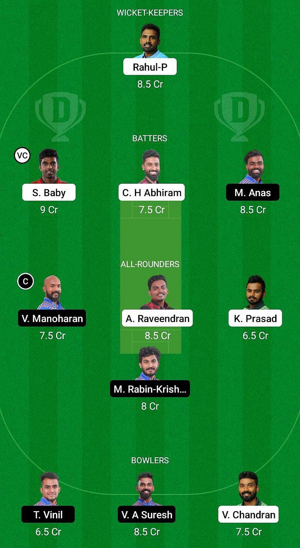 Bowlers: Vinil TS, Vishweshwar Suresh, Vaishak Chandran