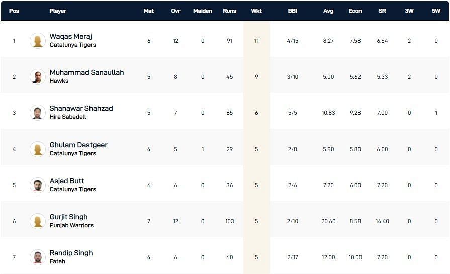 Punjab Warriors' Gurjit Singh (5), Gagandeep Singh (4), Manpreet Singh (4) and Ubaid Ul Rehman (4), Montcada Royal's Adeel Raja (4) and Aamir Shahzad (3), and Falco's Adeel Sarwar (3), Nadeem Shahzad (2) and Muhammad Sheraz (2) are the most successful bowlers of their respective teams.