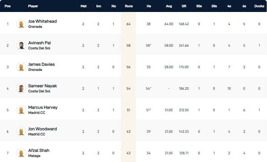 Granada's Joe Whitehead is the highest run-scorer after the first day of action in the ECS Cartama T10 League 2022. He has amassed 64 runs in two matches, with 38 being his highest score. Whitehead has an impressive strike rate of 168.42 and has struck four fours and five sixes.