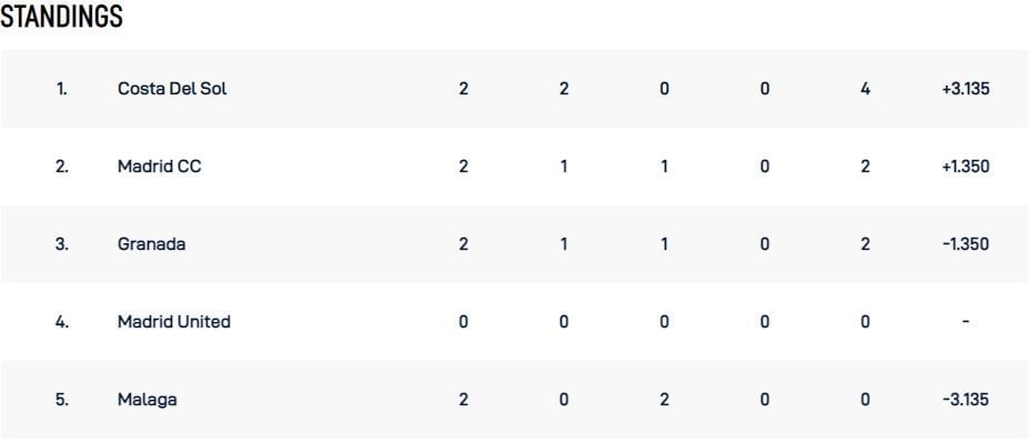 Madrid CC and Granada occupy the second and third spots in the standings. Both sides have two points, having won and lost a match apiece, with the former having a better net run rate.
