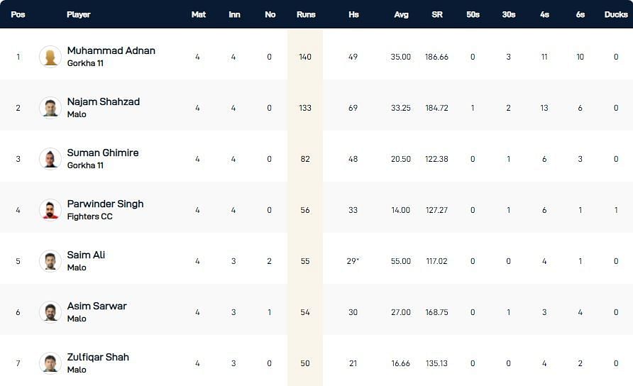 Gorkha 11's Muhammad Adnan and Madhukar Thapa have accounted for five dismissals apiece thus far. The former is placed second on the wicket-taking charts by virtue of being more economical.